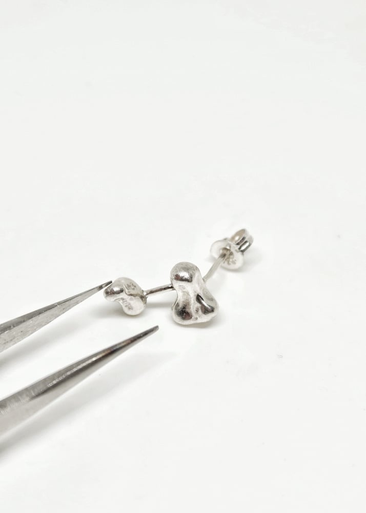 FABRICATED FROM RECYCLED 925 STERLING SILVER THROUGH A CASTING PROCESS THAT YIELDS UNIQUE GEOMETRIC VARIATIONS. EACH UNIT IS FITTED WITH 925 STERLING SILVER FINDINGS FOR DURABILITY AND CONDUCTIVITY.